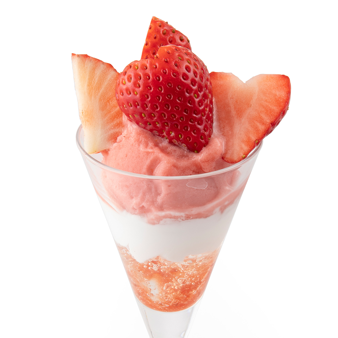 苺の香りと甘酸っぱさをしっかりと感じられる店内製造シャーベットと苺ソース、コアントローゼリー、ディプロマットクリームを重ねたパフェです。
