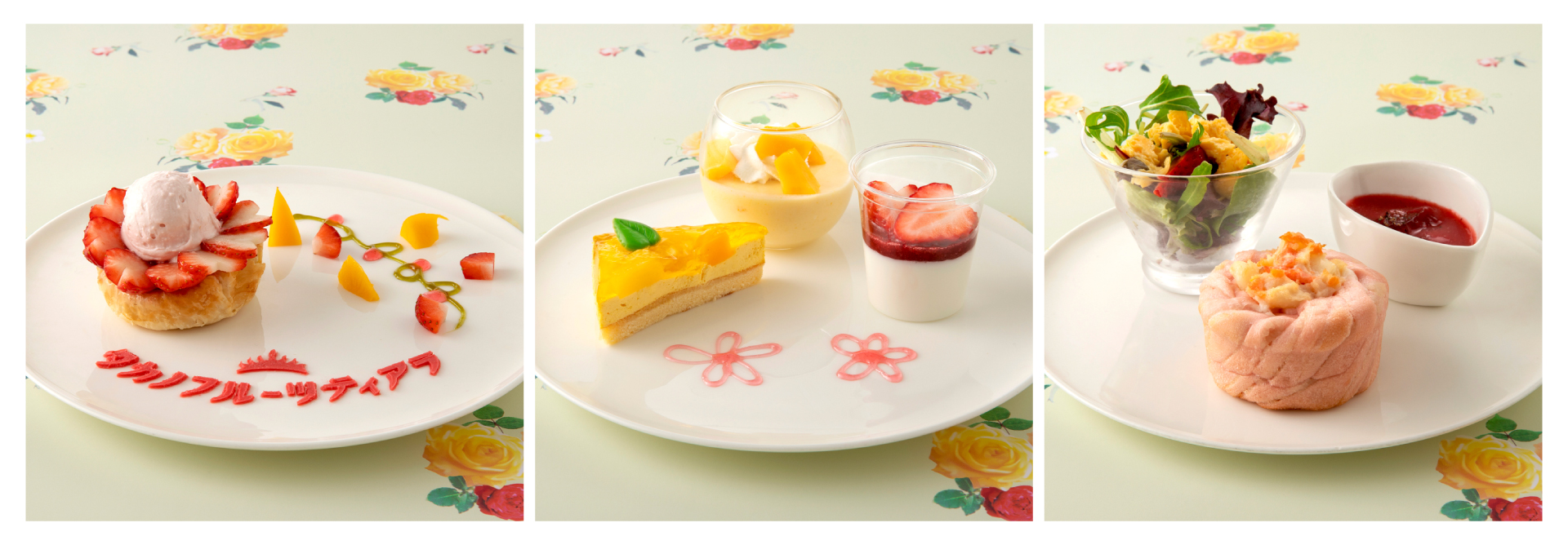〈下段〉ポテトサラダのフラワーブレッド/苺とコンソメの冷製スープ/ミモザ風苺のガーデンサラダ