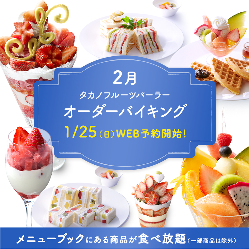 メニューブックにある商品(一部商品は除外)が食べ放題になるオーダーバイキングを開催します。最初に2品とドリンク1品をご注文いただきます。その後は食べ終えたグラス、またはお皿と交換で次のオーダーができます(ただし、コーヒーまたは紅茶またはカフェオレはいつでもオーダー可能)。旬の果物を使った商品や、普段は選ばないものなど、この機会に心ゆくまでお楽しみください。ご予約人数にかぎりがございますので、早めのご予約をおすすめします。