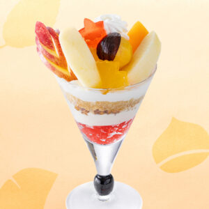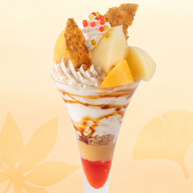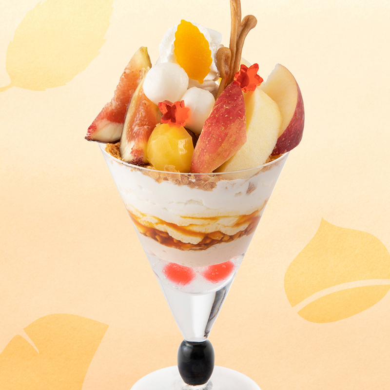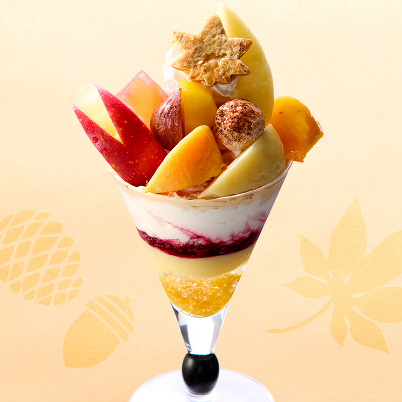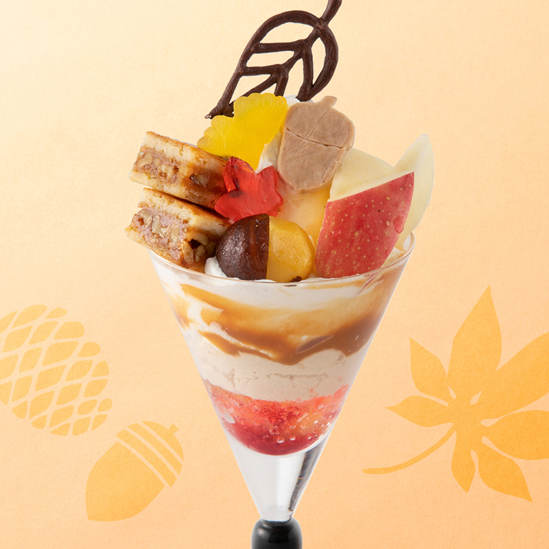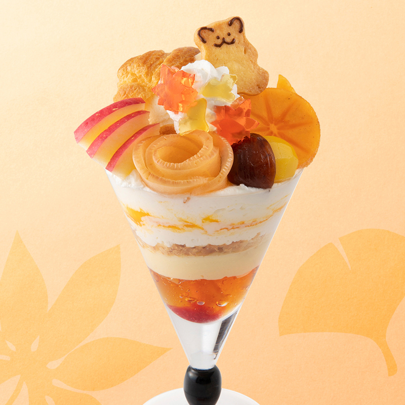 秋のやさしい色合いと、秋の味覚を閉じ込めた季節限定のパフェをご用意しました。実りの秋に収穫されたフルーツを、秋色に染まったパーツと組み合わせ丁寧に仕立てています。リスやくま、どんぐりなどの可愛らしい焼き菓子のパフェや、紅葉をイメージした色合いのパフェなど、店舗ごとに異なるデザインです。季節のフルーツとともにほっと心和む甘さで、秋のひとときをお届けします。