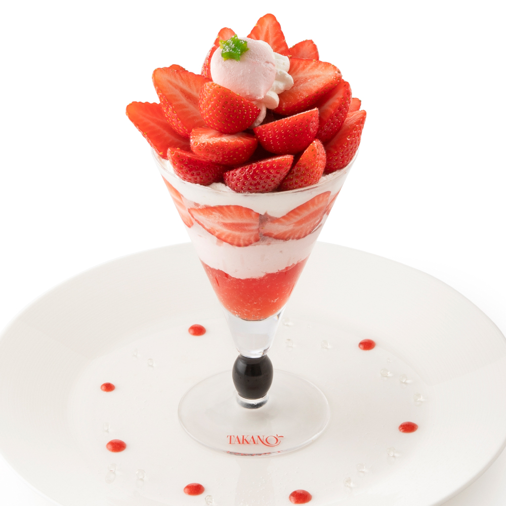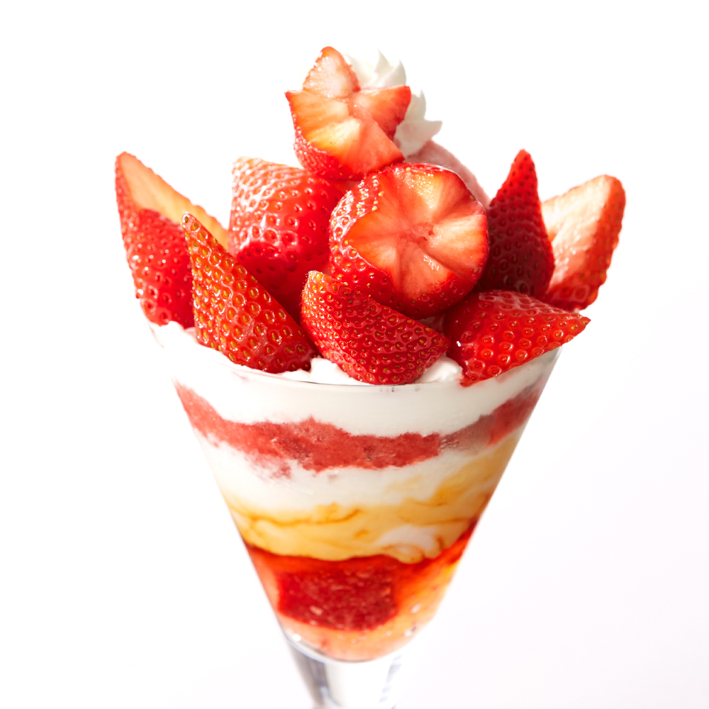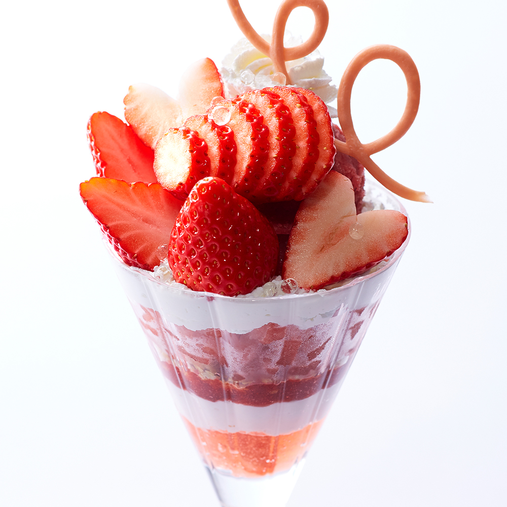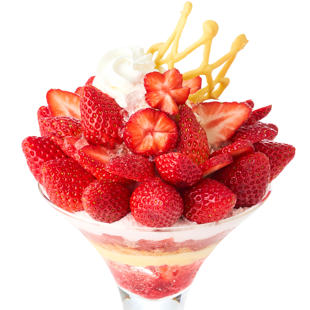 シーズナルメニュー「苺のパフェ」の2倍の量の苺を飾りつけたパフェです。