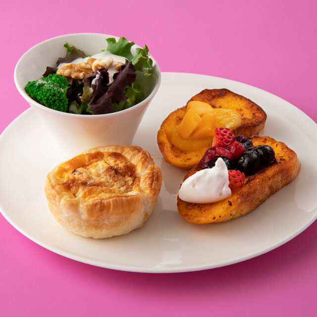 フレンチトースト〜ミックスベリー&柿〜、りんごとベーコンのキッシュ、グリーンサラダ