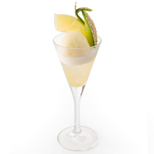 メロンの香りを感じる店内製造のシャーベットとメロンソース、コアントロゼリー、ディプロマットクリームを重ねたパフェです。