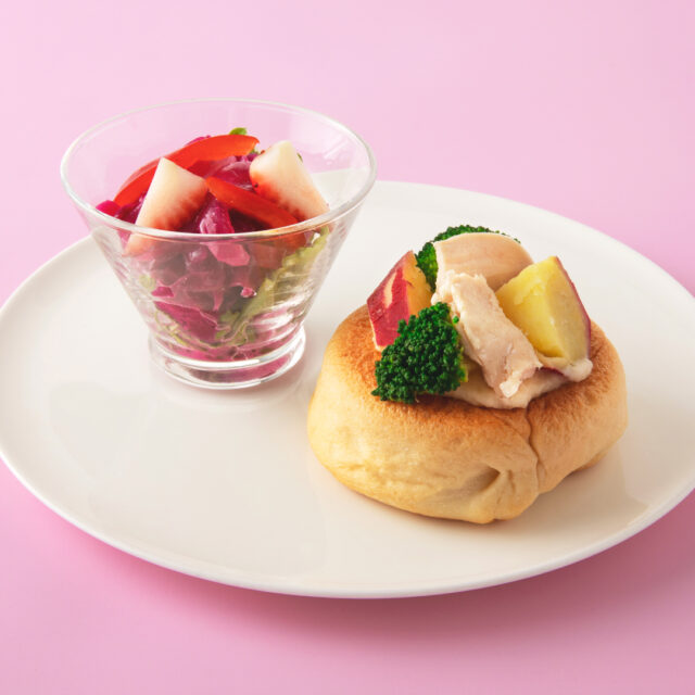 チキンとブロッコリーのリングパン、赤キャベツと苺のサラダ