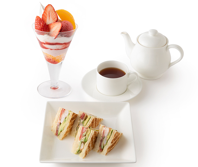 「えび・アボカド・タルタルサンド」と「ミニ 苺と柑橘のパフェ※4/24(金)まで」がセットになったメニューです。パフェはプラス税込¥550(本体価格¥500)で「ミニ マスクメロンパフェ※3/31(火)までに変更できます。