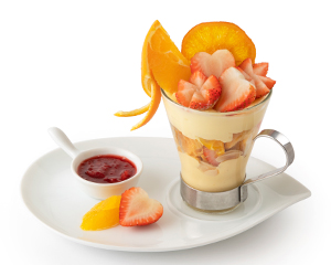 デザートは「ナイト 苺と柑橘のパフェ ※4/30(木)まで」「ナイト フルーツパフェ」「ナイト チョコパフェ」よりお選びいただけます。プラス税込¥550(本体価格¥500)で「ナイト マスクメロンパフェ」に変更できます。