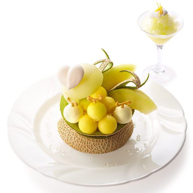 ベリーの深い香りと艶やかな色彩で全体をまとめています。ラズベリーとクランベリーが合わさったゼリーに、ラズベリークリームがふんわりと交わり、苺りんごグラニテやベリーシャーベットがさっぱりと重なります。