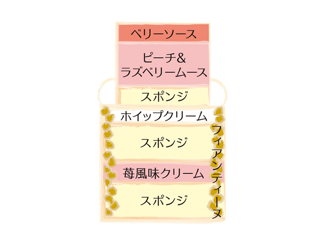 苺風味のクリームをサンドしたケーキにピーチ&ラズベリームースをのせフルーツをデコレイト。