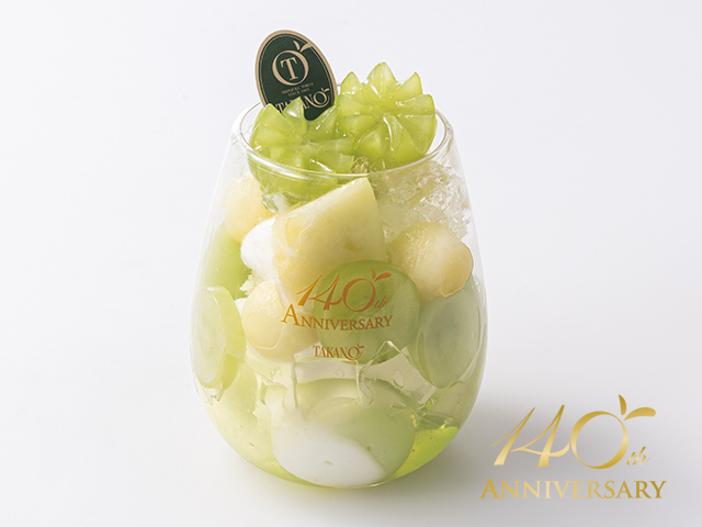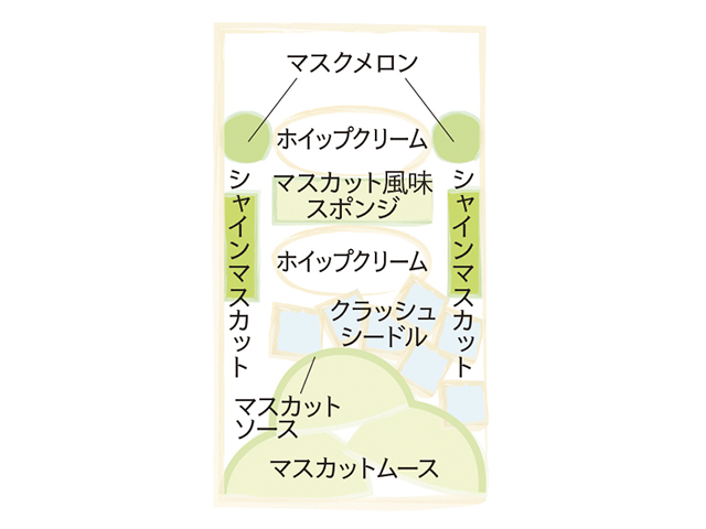 マスカット風味のスポンジ、マスカットムース、マスクメロン、シャインマスカットなどを重ねたデザート。