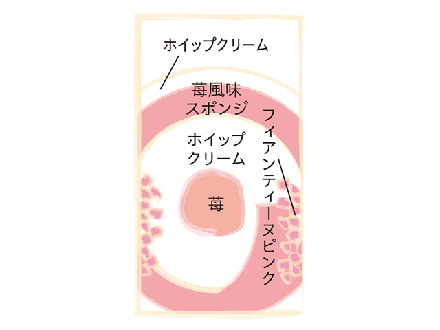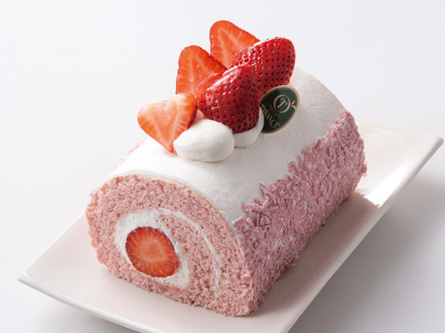 苺風味のスポンジで巻いたロールケーキに苺を可愛らしくトッピング。