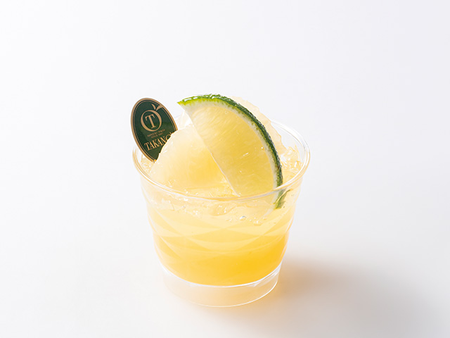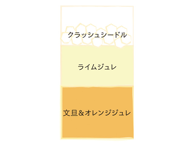 文旦&オレンジジュレにライムジュレを重ね、ライムとメロゴールドを飾りました。