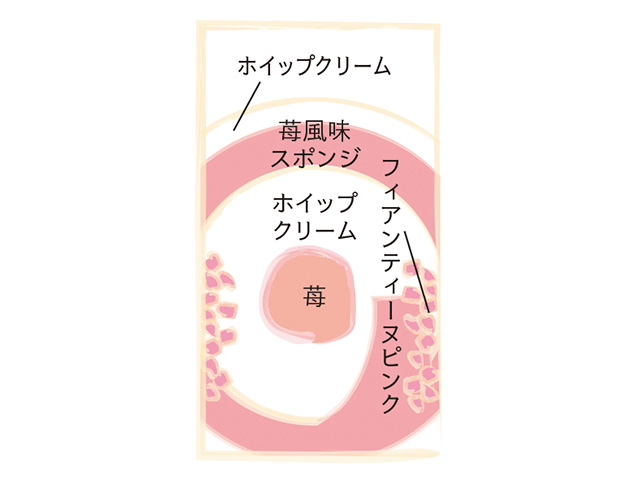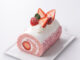 苺風味のスポンジで巻いたロールケーキに苺を可愛らしくトッピング。