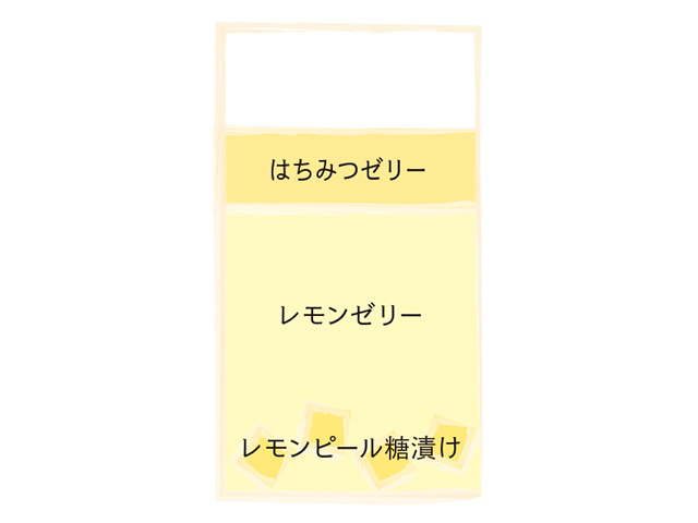 糖漬けのレモンピール入りのレモンゼリーにはちみつゼリーを重ねた季節のデザート。