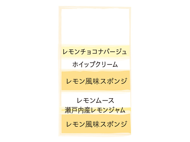 レモン風味スポンジでレモンのムースとジャムをサンドし、レモンチョコナパージュをかけたレモンづくしのショートケーキ。