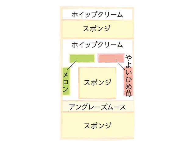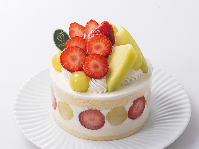 スポンジにアングレーズムースを重ね、やよいひめ苺とメロンで仕立てた季節のデコレーションケーキ。